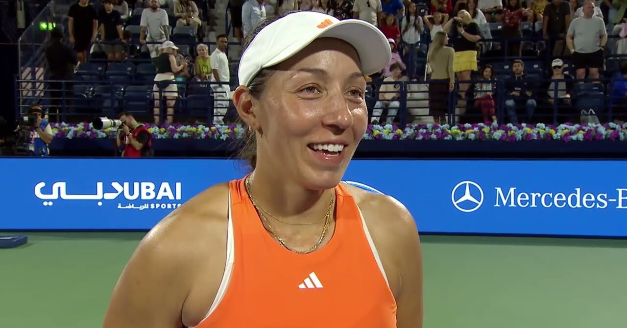 Jessica Pegula reacts to winning her semifinal match against Amanda Anisimova under the lights inside Dubai Duty Free Tennis Stadium on Friday, February 20, 2026.