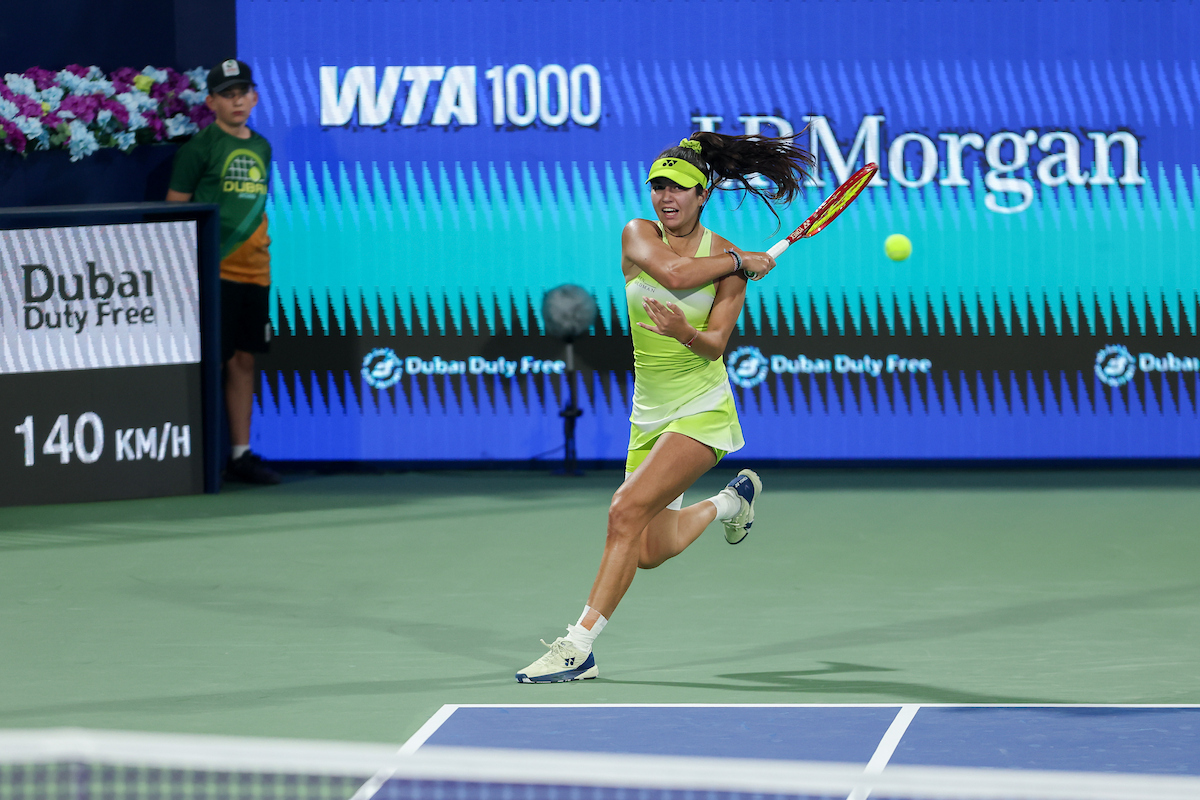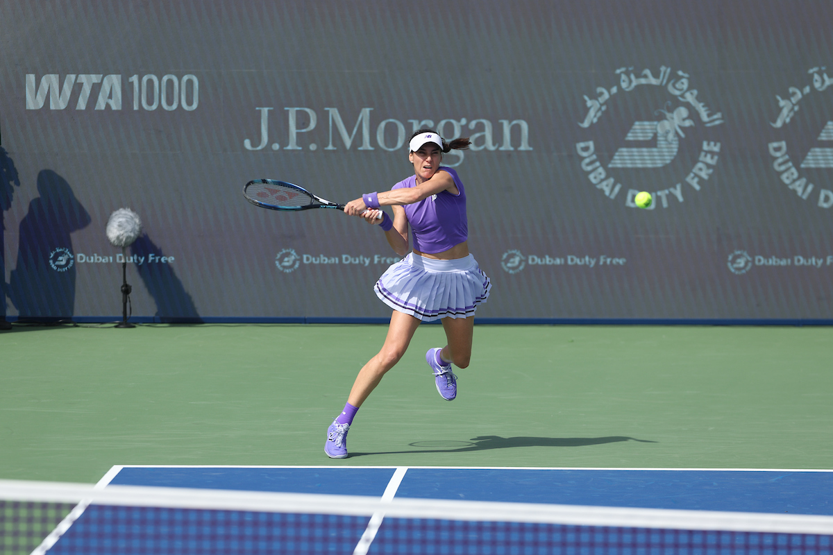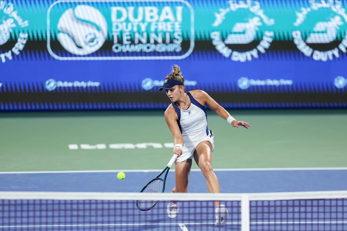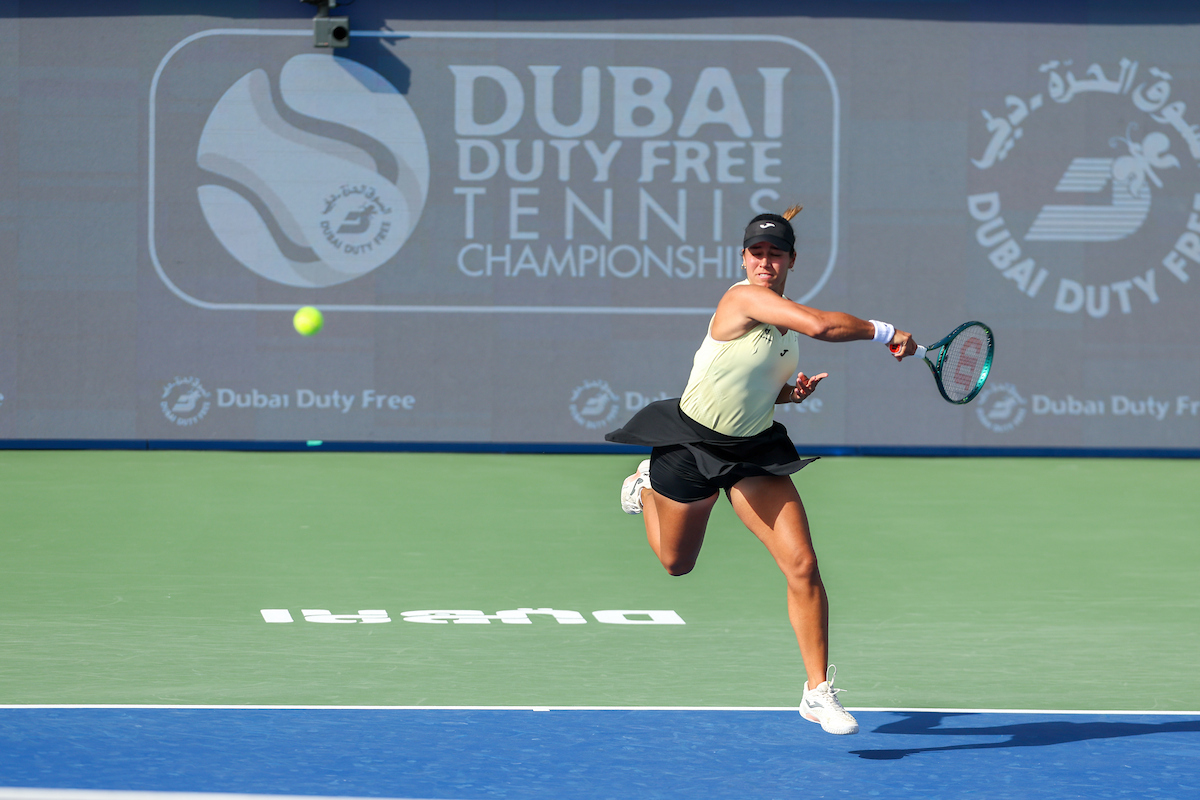See photos from Day 2 of WTA action at the 2026 Dubai Duty Free Tennis Championships, featuring Paula Badosa, Anna Kalinskaya, Iva Jovic, and others.